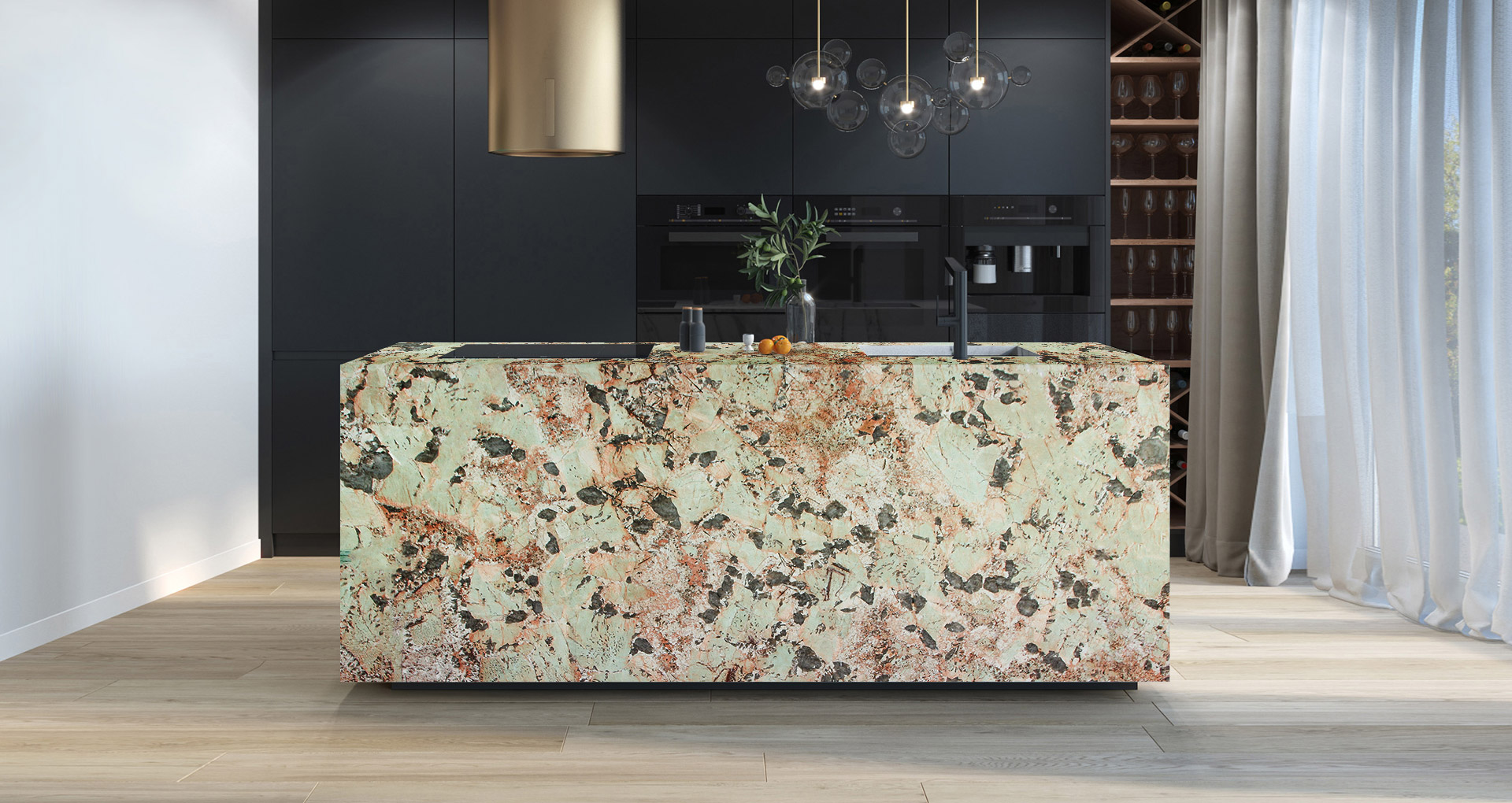 Amazzonite è una quarzite brasiliana composta da una texture principalmente turchese, ed impreziosito da sfumature e venature sparse di verde, tortora e bianco. Di media durezza, è un materiale utilizzato principalmente come pavimenti o rivestimenti in realizzazioni interne. Viene consigliato in finitura lucida.