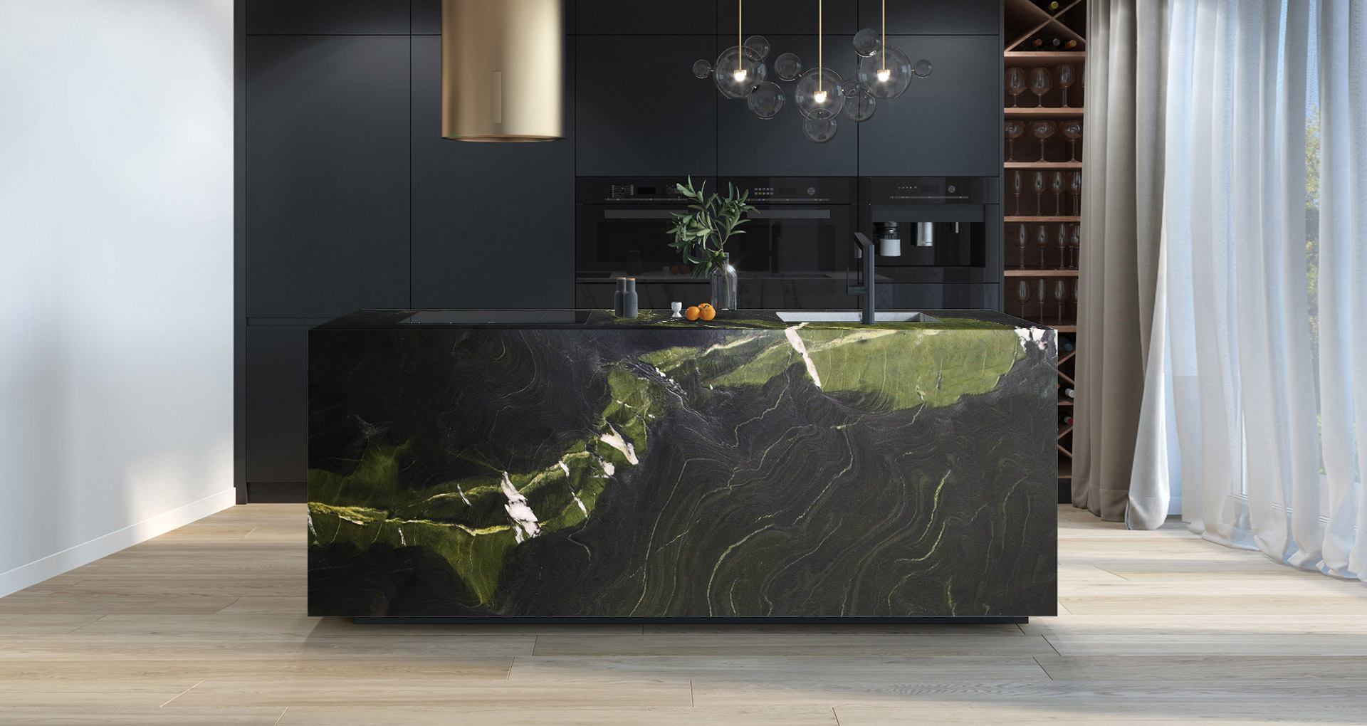 Quarzite proveniente dal brasile dai colori intensi che richiamano il fascino esotico della foresta. Il colore verde che fa da padrone a questo materiale crea un effetto nuvolato che si estende in tonalità più scure. Venature bianche e nere impreziosiscono questa pietra naturale che risulta essere di una straordinaria durezza e resistenza. Ideale per edilizia, arredamenti, pavimentazioni e rivestimenti, l'avocadus viene spesso lavorato con finitura levigata che ne esalta colori e caratteristiche tecniche.