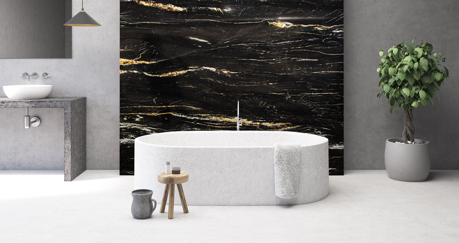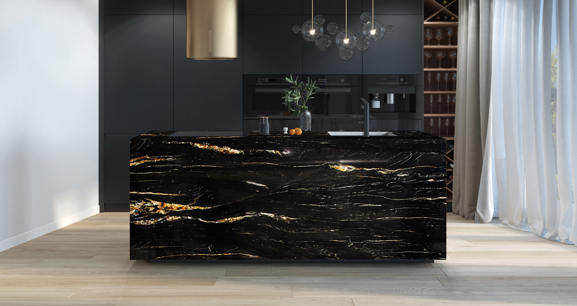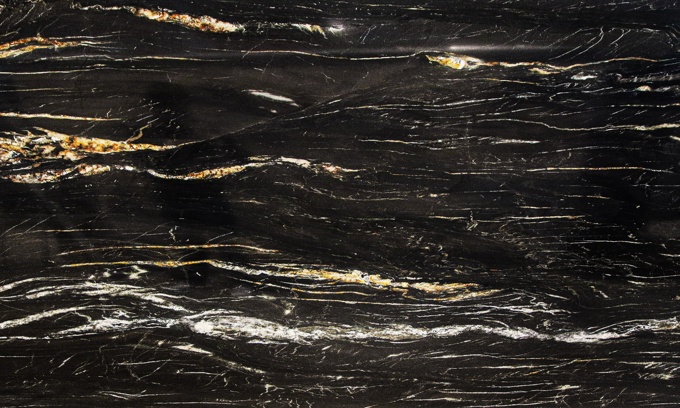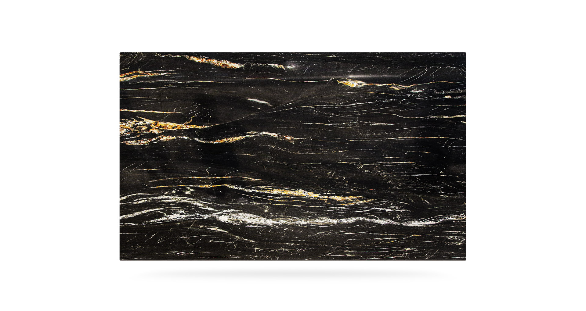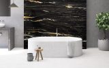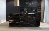 Quarzite a grana fine dallo sfondo nero profondo, attraversato da venature bianche ed oro che creano un contrasto naturale dal forte impatto. Proveniente dal sud Africa, questa quarzite nera è considerata uno tra i materiali più duri e resistenti, con un basso grado di assorbimento dei liquidi e grassi. Belvedere è un materiale ideale per la realizzazione di pavimenti, piani cucina e rivestimenti a parete.