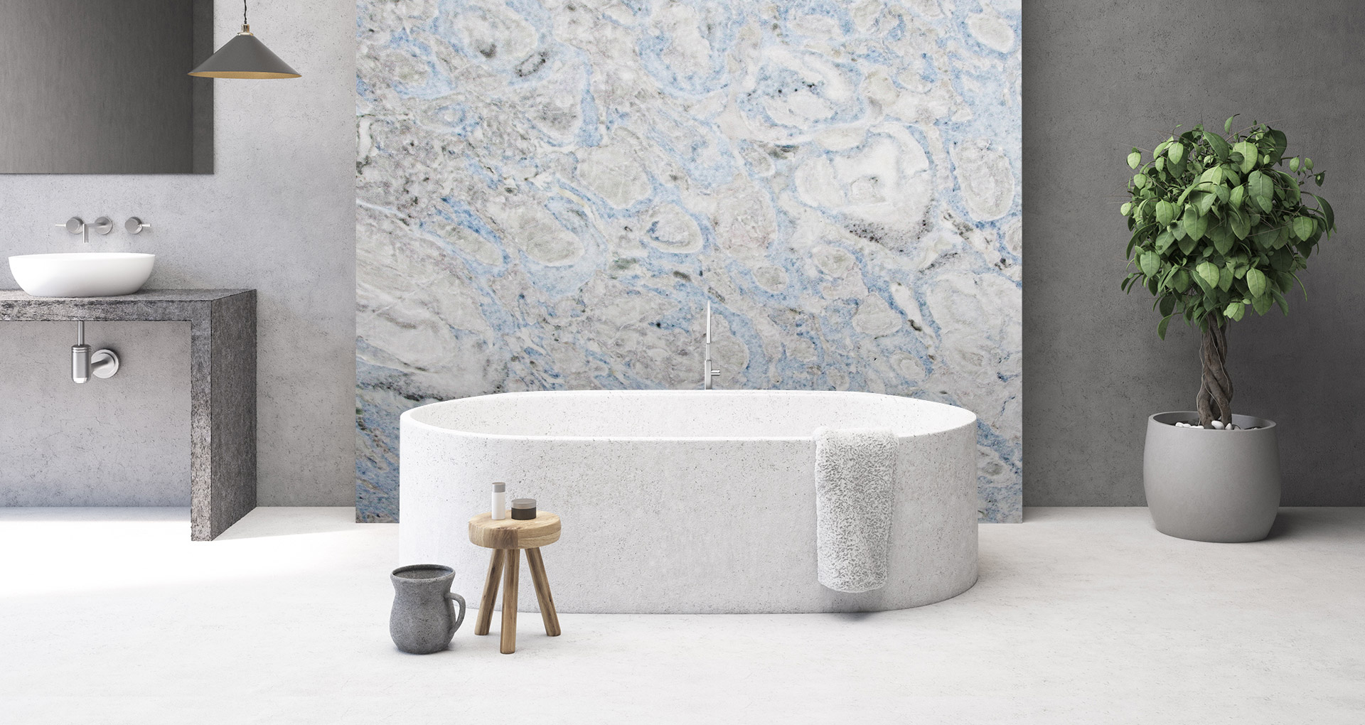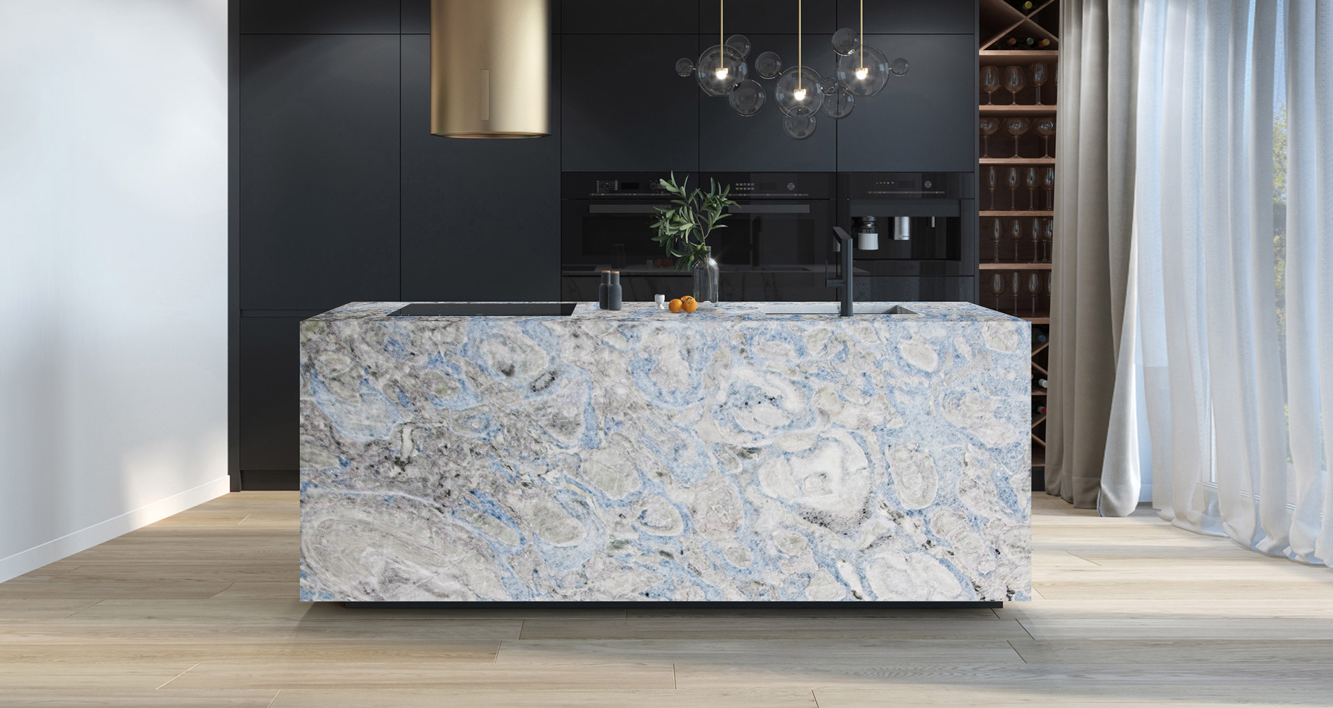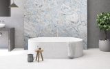 Artic Blue è una dolomite di origine turca che si distingue per una palette cromatica fredda e raffinata. Le superfici sono attraversate da sfumature irregolari di blu, azzurro, bianco e nero, che conferiscono profondità visiva e rendono ogni lastra un elemento unico e non replicabile.