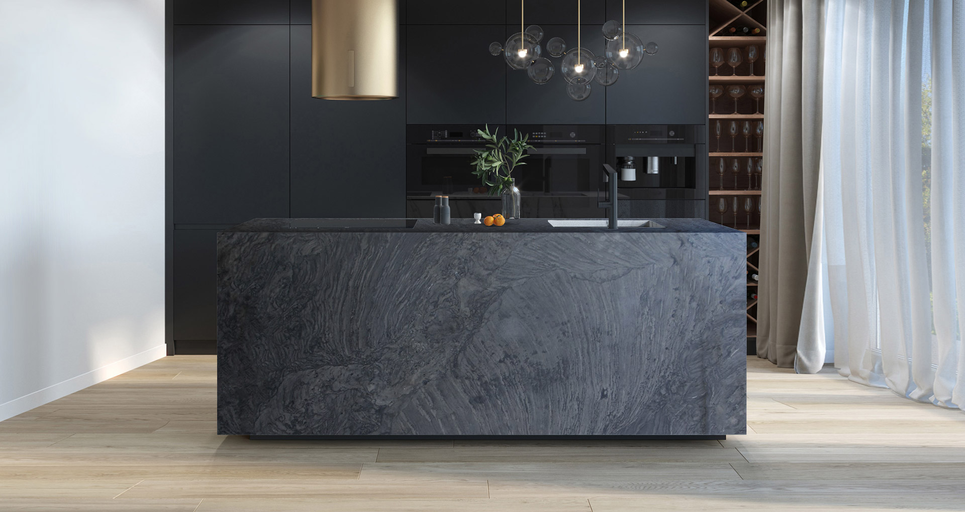 Quarzite proveniente dal Brasile dai toni scuri: sfumature di blu e grigio sono le protagoniste di questa pietra naturale dal fascino misterioso, a cui si alternano venature fini e sorprendenti che donano profondità alle lastre. Resistente al calore ed all'usura, New Adamantium è un materiale ricercato per la realizzazione di ambienti a cui si vuole garantire eleganza ed unicità. Ideale per pavimenti, rivestimenti a parete, piani cucina ed accenti decorativi.