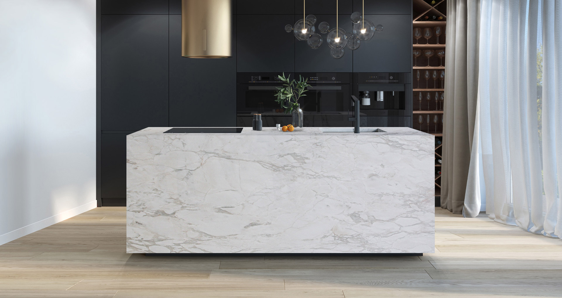 Marmo namibiano con una colorazione generalmente uniforme sui toni del bianco e con marcate venature beige. Calacatta Onice è particolarmente adatto per interni.