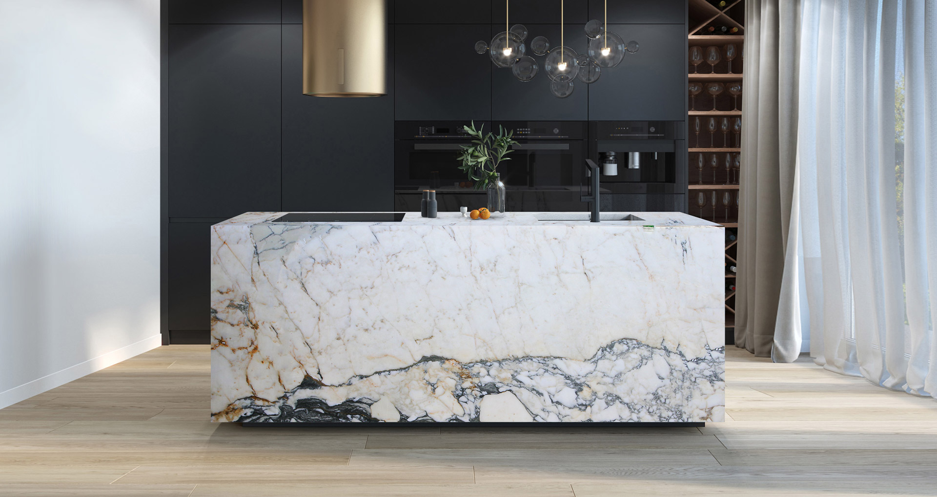 Marmo italiano proveniente dal Monte Corchia. Il fondo bianco è attraversato da ramificazioni di venature grigio-blu che creano ovuli irregolari di diverse dimensioni e danno alla lastra l'aspetto di un arabesco. Questa pietra elegante di lunga tradizione risulta particolarmente dura e naturalmente capace di resistere ad abrasioni e sbalzi termici. Trova impiego in realizzazioni interne come pavimenti e rivestimenti a parete, e ambienti outdoor come vialetti e porticati.