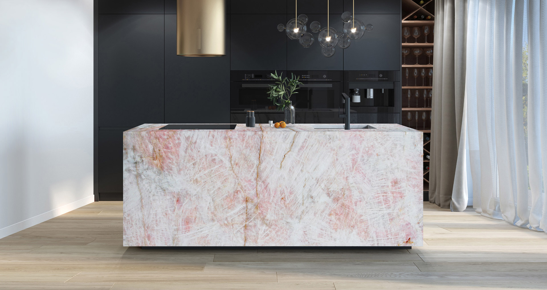 Elegante quarzite dal colore rosa arricchita da venature avorio e lilla. Importata dal Brasile, si distingue per la sua struttura nuvolata e trasparente che si presta ad essere retroilluminata. Cristallo Rosa è una pietra naturalmente resistente agli acidi ed agli sbalzi termici, per questo utilizzabile anche per piani cucina oltre che per rivestimenti a parete e pavimenti a macchia aperta.