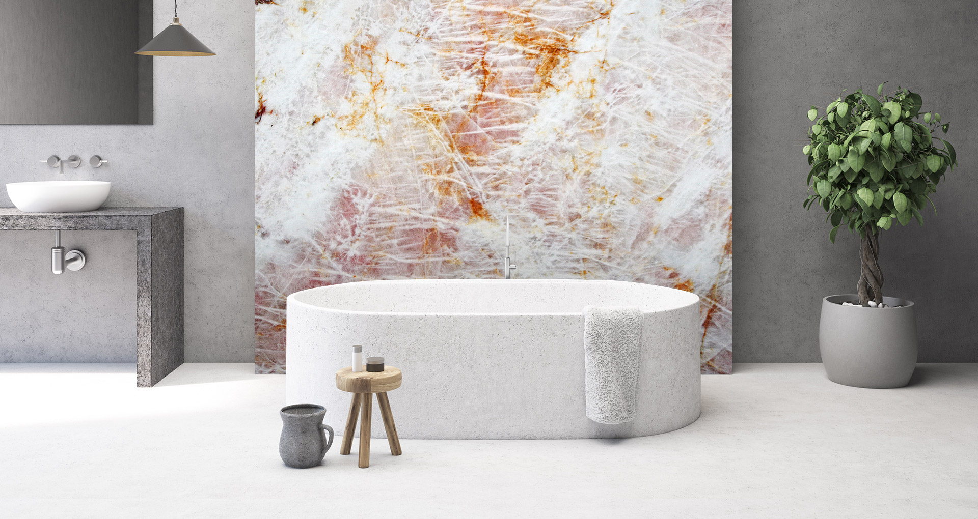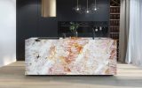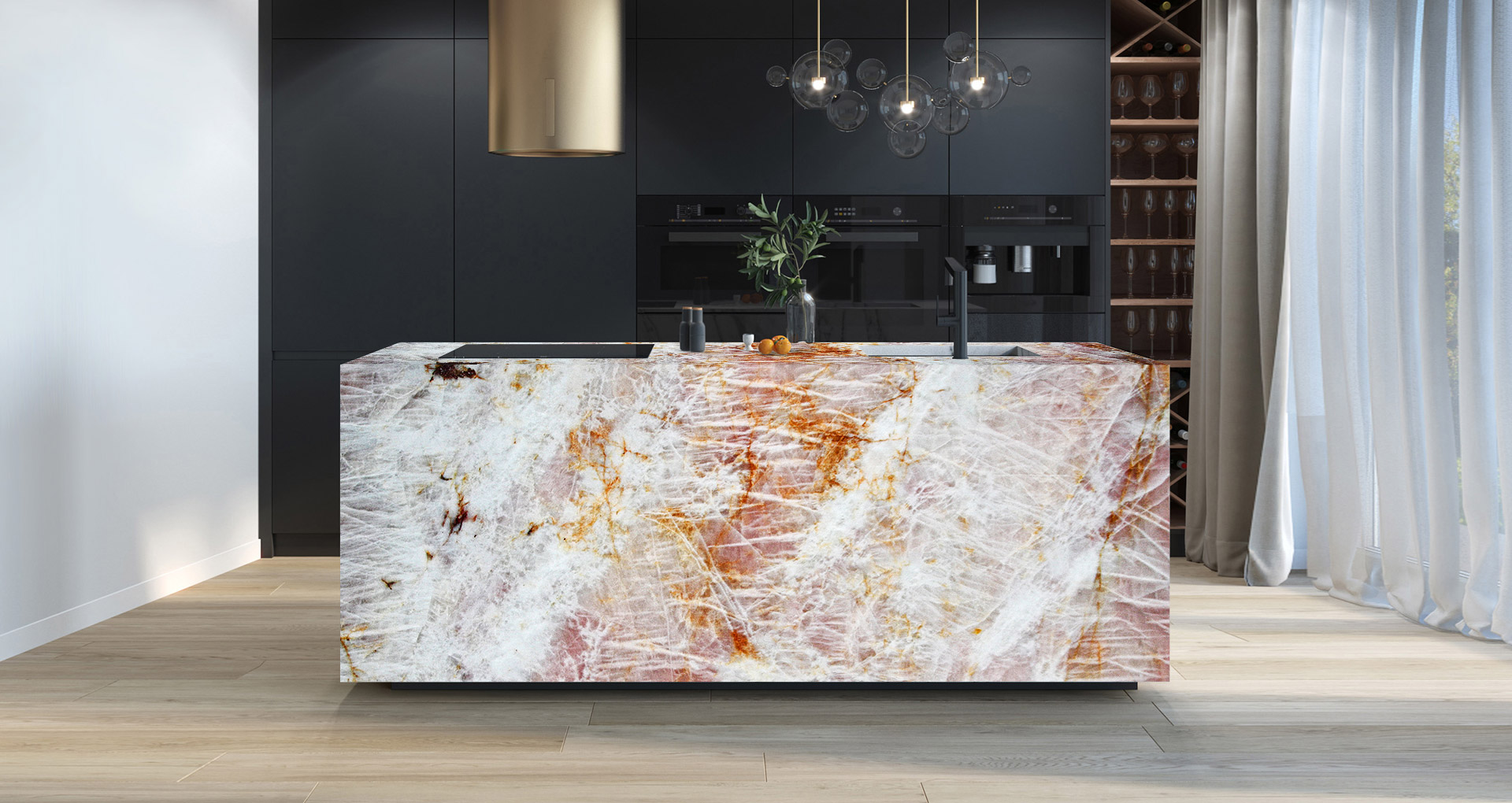 Elegante quarzite dal colore rosa arricchita da venature avorio e lilla. Importata dal Brasile, si distingue per la sua struttura nuvolata e trasparente che si presta ad essere retroilluminata. Cristallo Rosa è una pietra naturalmente resistente agli acidi ed agli sbalzi termici, per questo utilizzabile anche per piani cucina oltre che per rivestimenti a parete e pavimenti a macchia aperta.