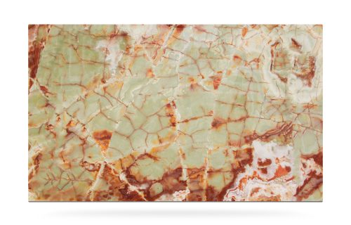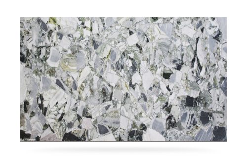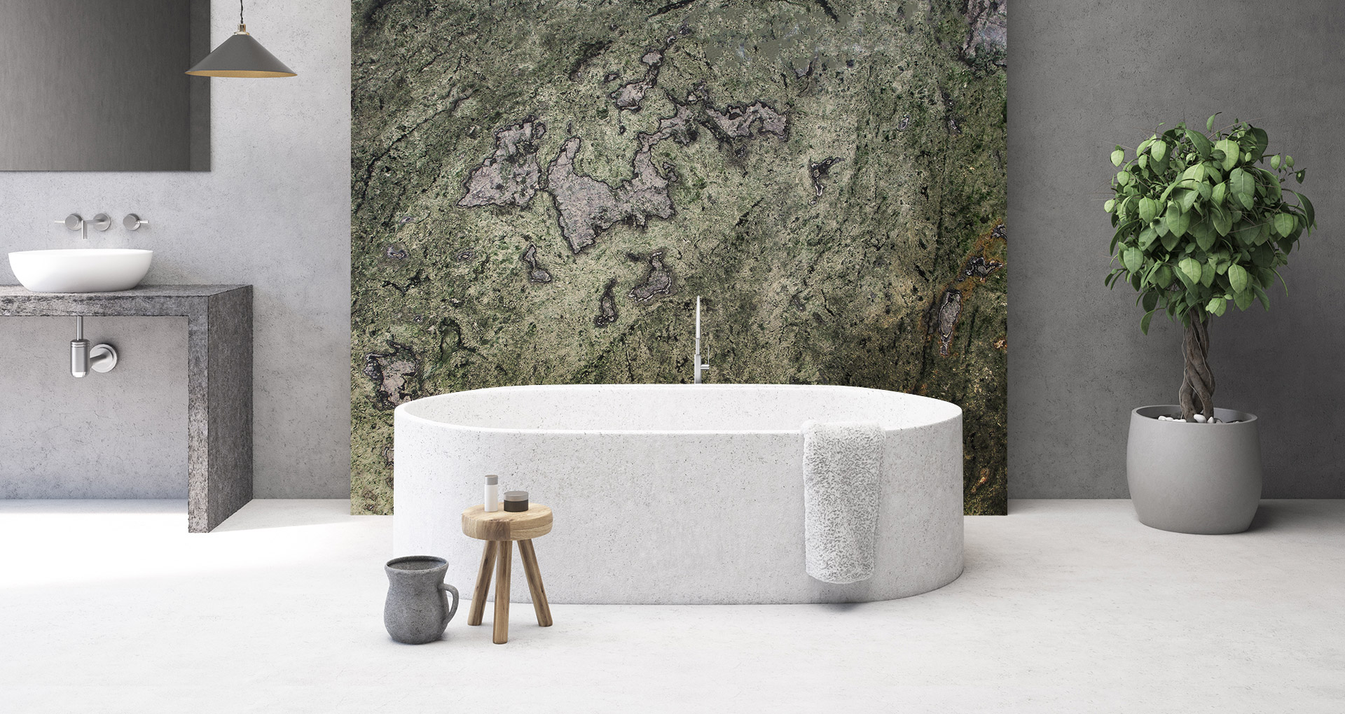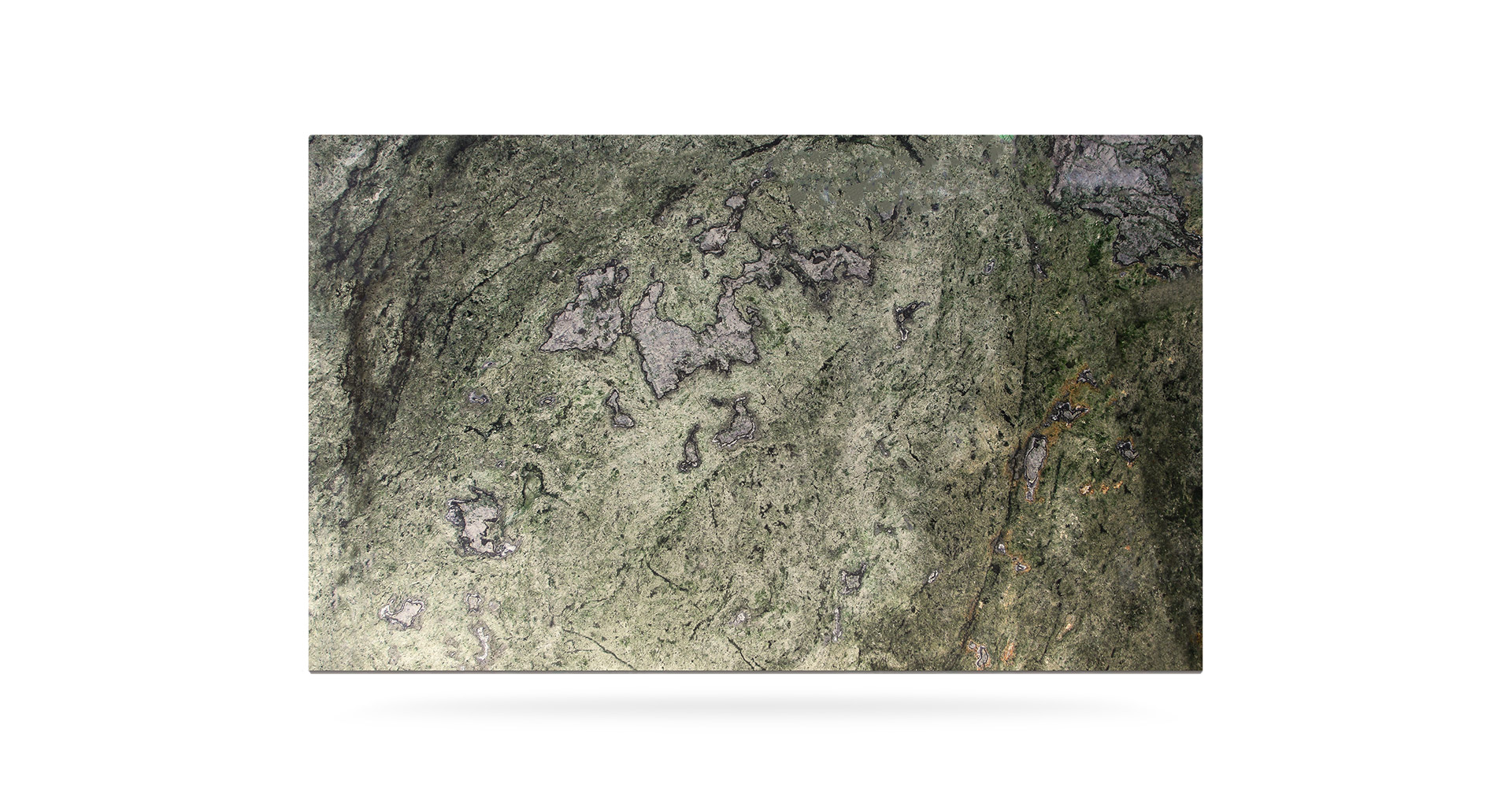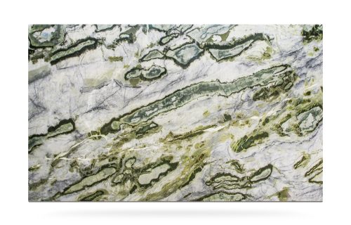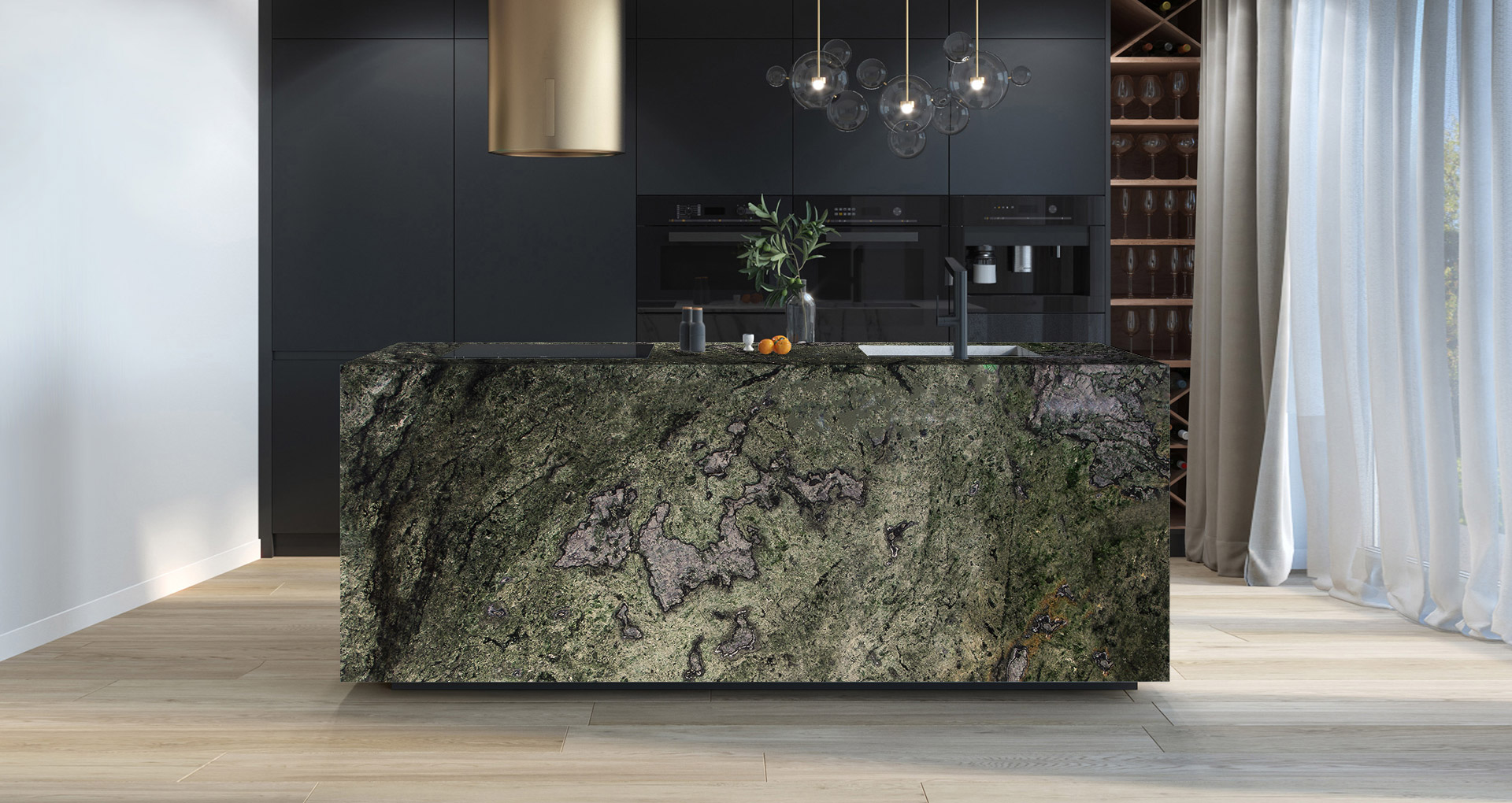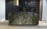Quarzite Epidoto, originaria del Brasile, cattura per il suo colore verde intenso e per le pietre di Smeraldo che si trovano nel suo interno. La profonda resistenza della Quarzite permette di adattarsi perfettamente a svariate applicazioni, interne ed esterne.