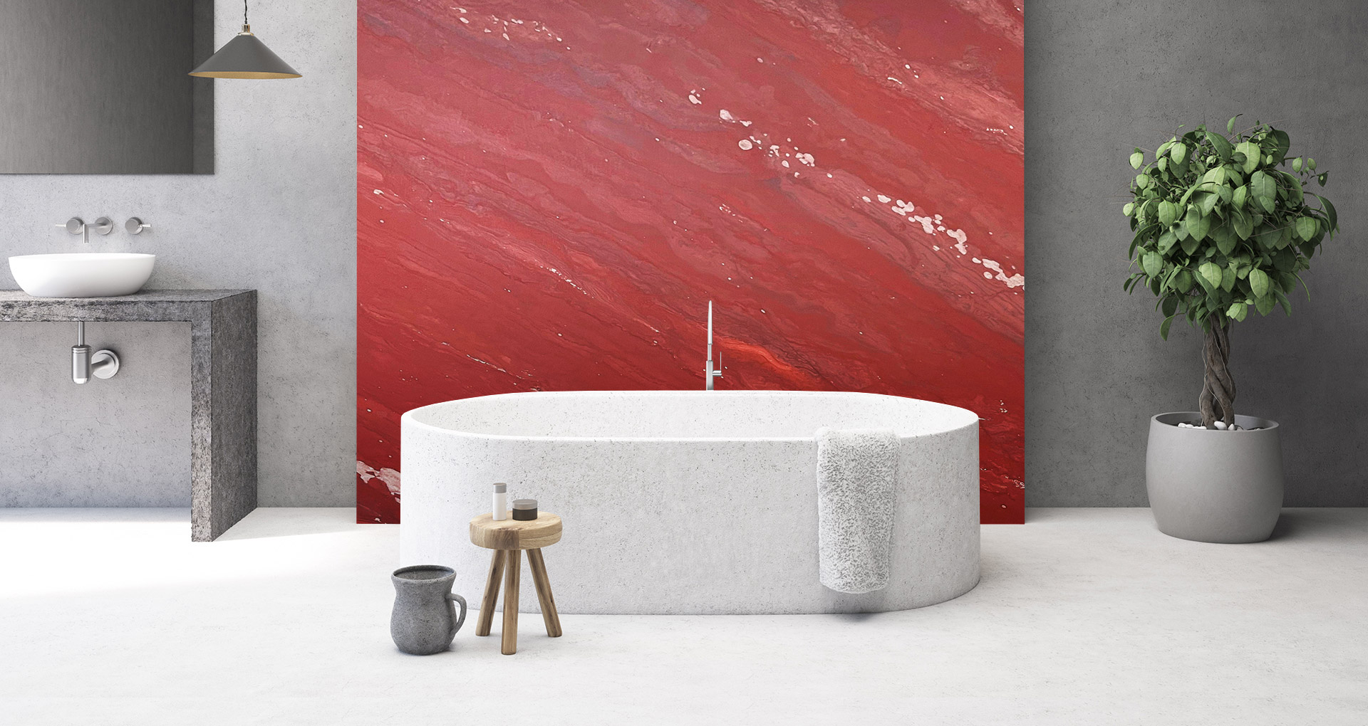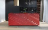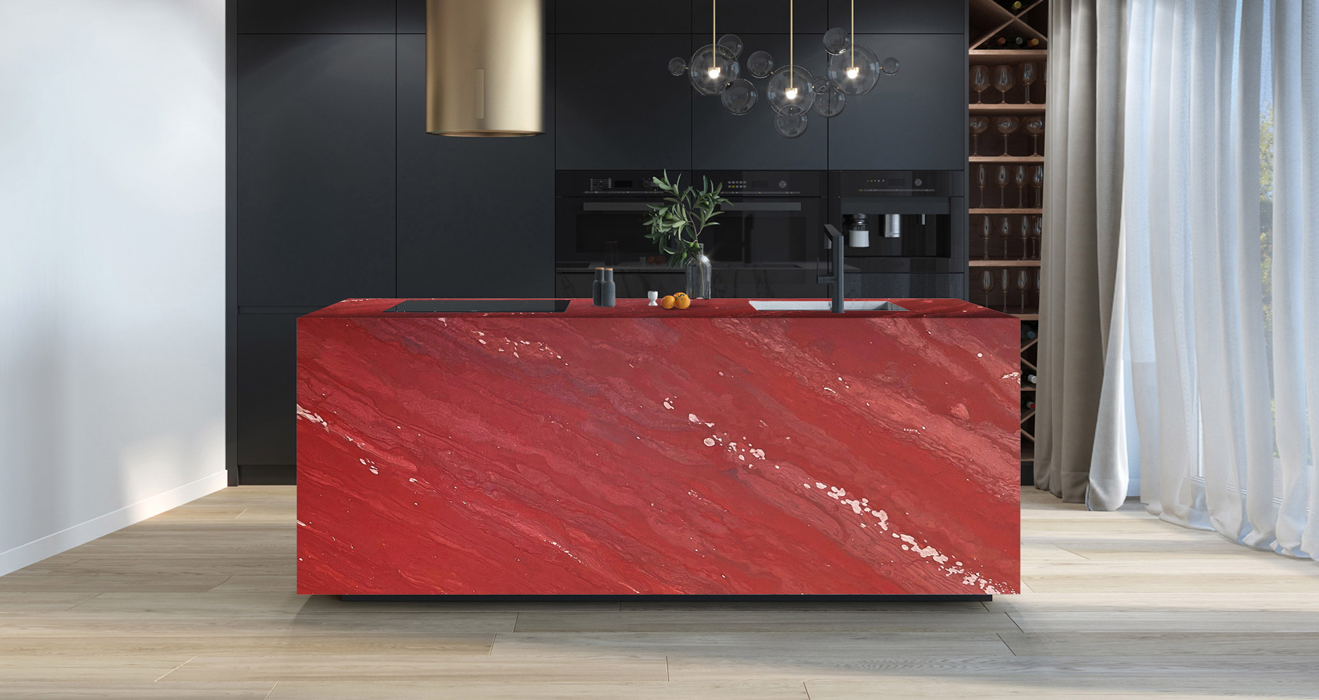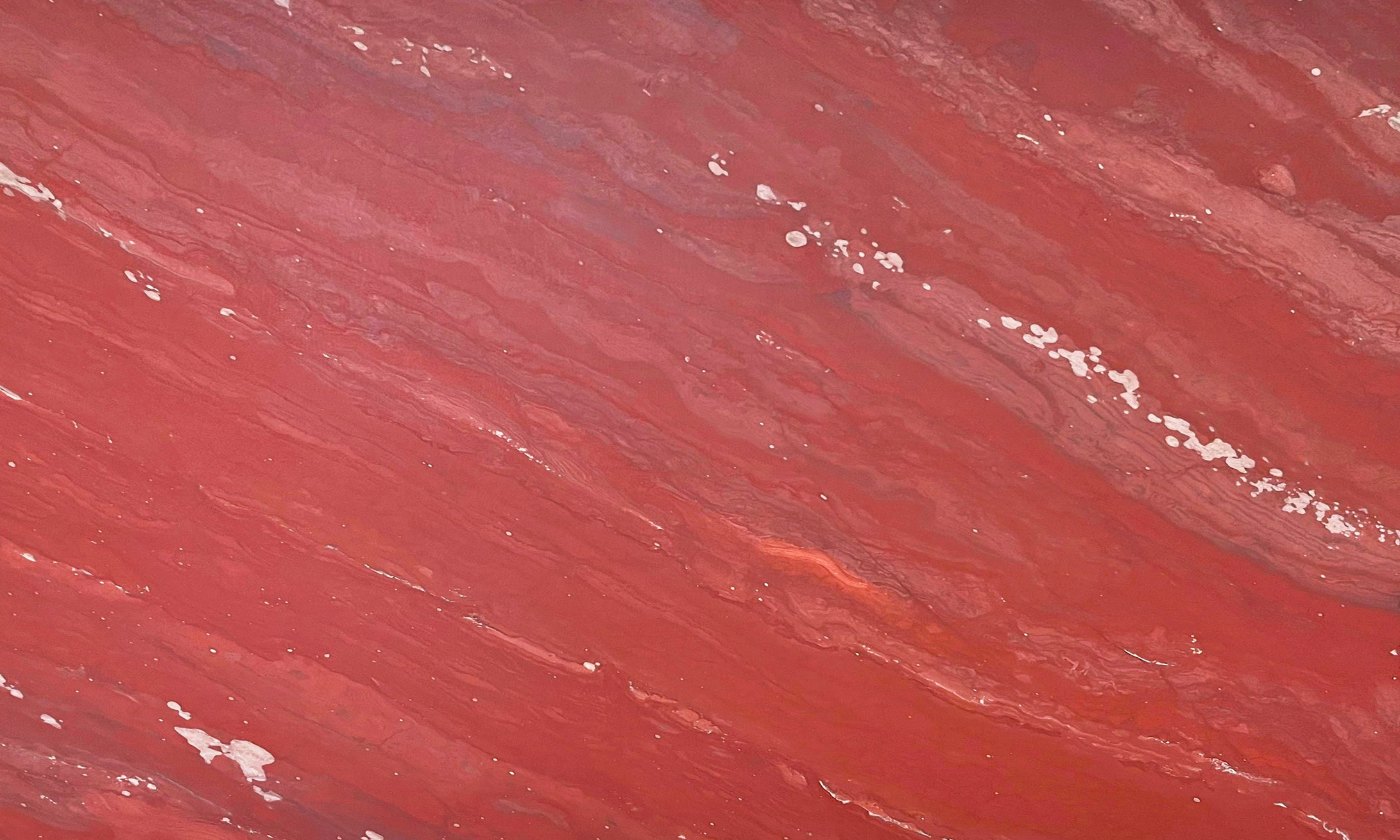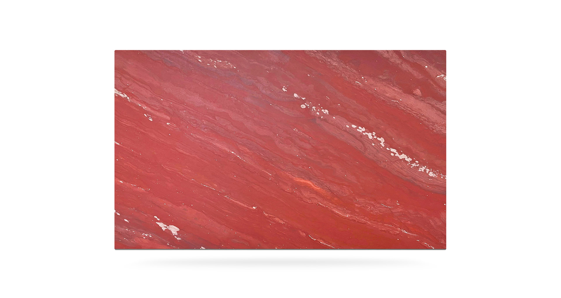 Jasper Red è una quarzite naturale di origine brasiliana, caratterizzata da una matrice compatta a grana fine con cromia dominante rosso intenso. La struttura presenta venature concordanti in tonalità analoghe e filamentazioni discontinue bianche, attribuibili alla presenza di minerali accessori silicatici.