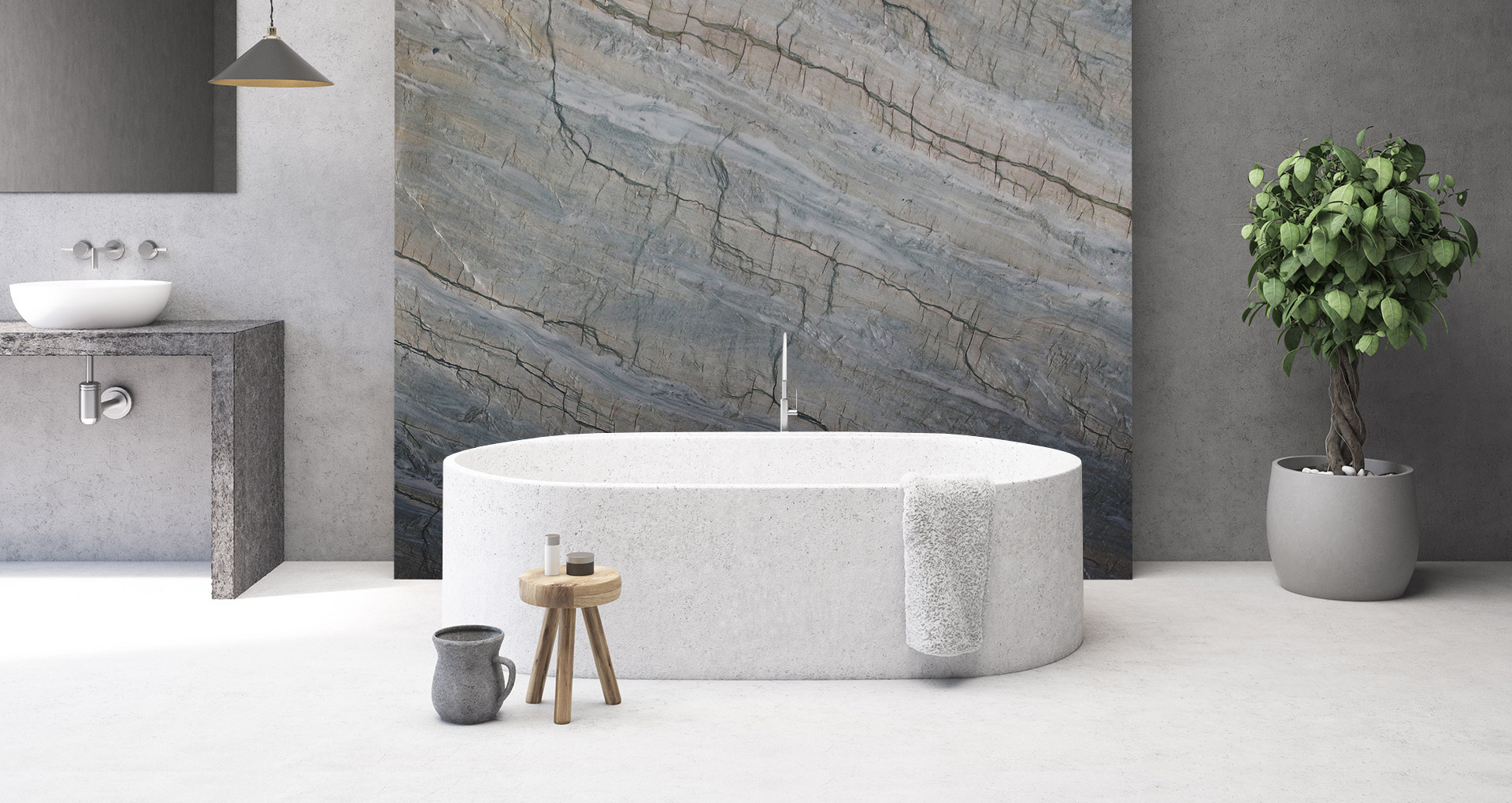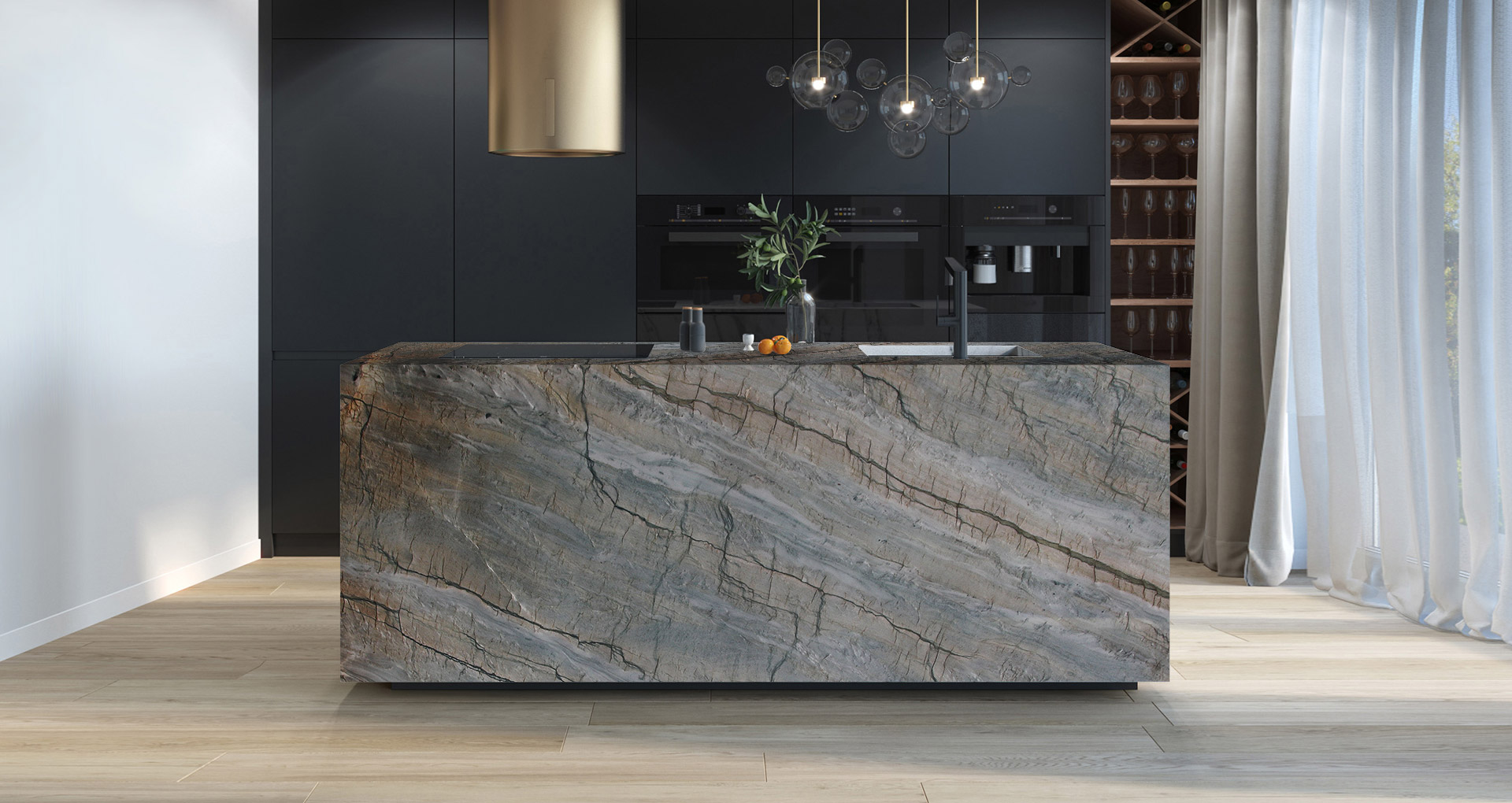 Quarzite ricca di venature blu e dai colori pastello su un fondo chiaro. Originaria del Brasile, è ideale per decorare con eleganza ambienti interni ed esterni. Particolarmente adatta per piani cucina, pavimenti e rivestimenti.