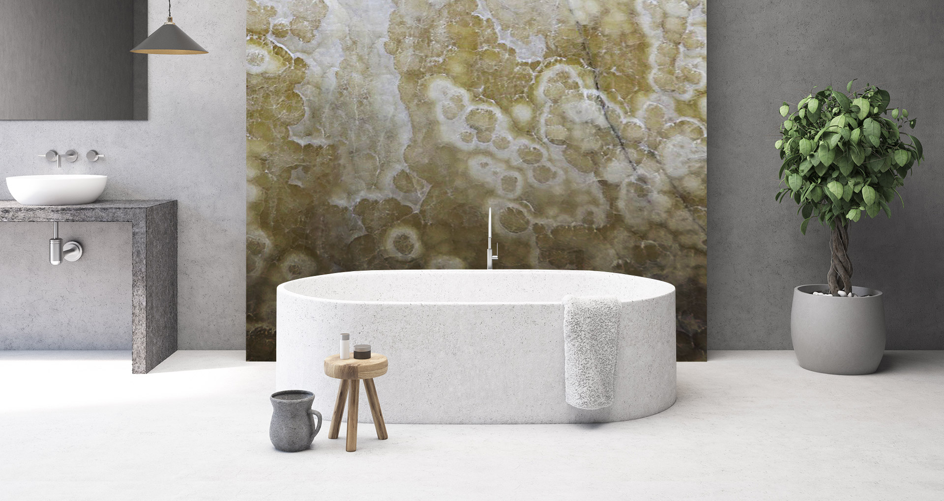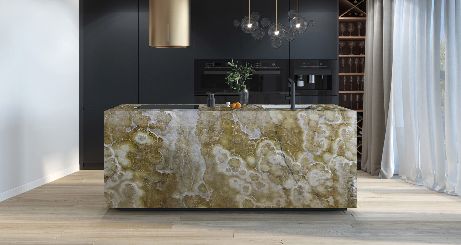 Onice proveniente dall'Iran, è un materiale molto particolare per il suo colore che varia dal giallo chiaro all'oro. Utilizzato principalmente in ambienti interni. Ideale per arredi, elementi artistici, oggettistica, sculture.