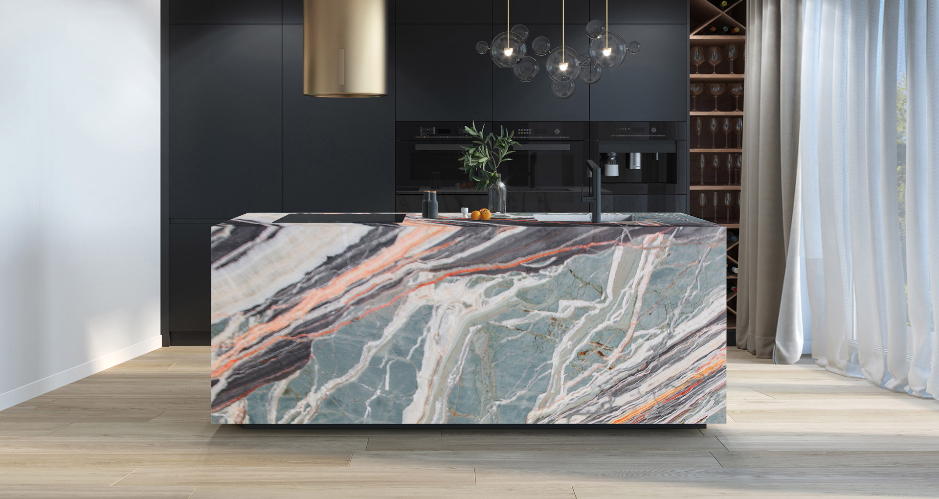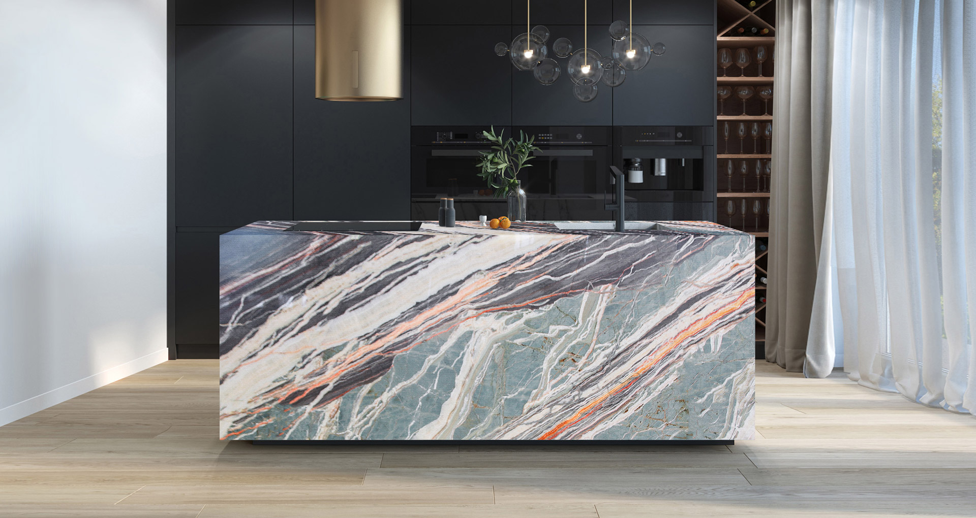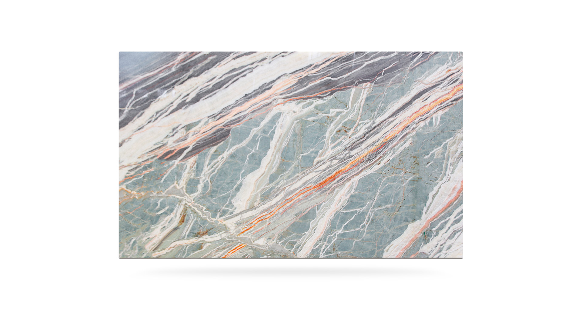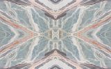 Pregiatissimo onice con varie sfumature, sulla graduazione del verde acqua, rendono ogni realizzazione diversa da quella precedente. La sua forma nuvolata viene interrotta talvolta da sottili venature arancioni che rappresentano una caratteristica distintiva di questo materiale. Essendo Onice rainbow un materiale naturalmente delicato, ne viene consigliato l'utilizzo in ambienti interni e con finitura lucida.