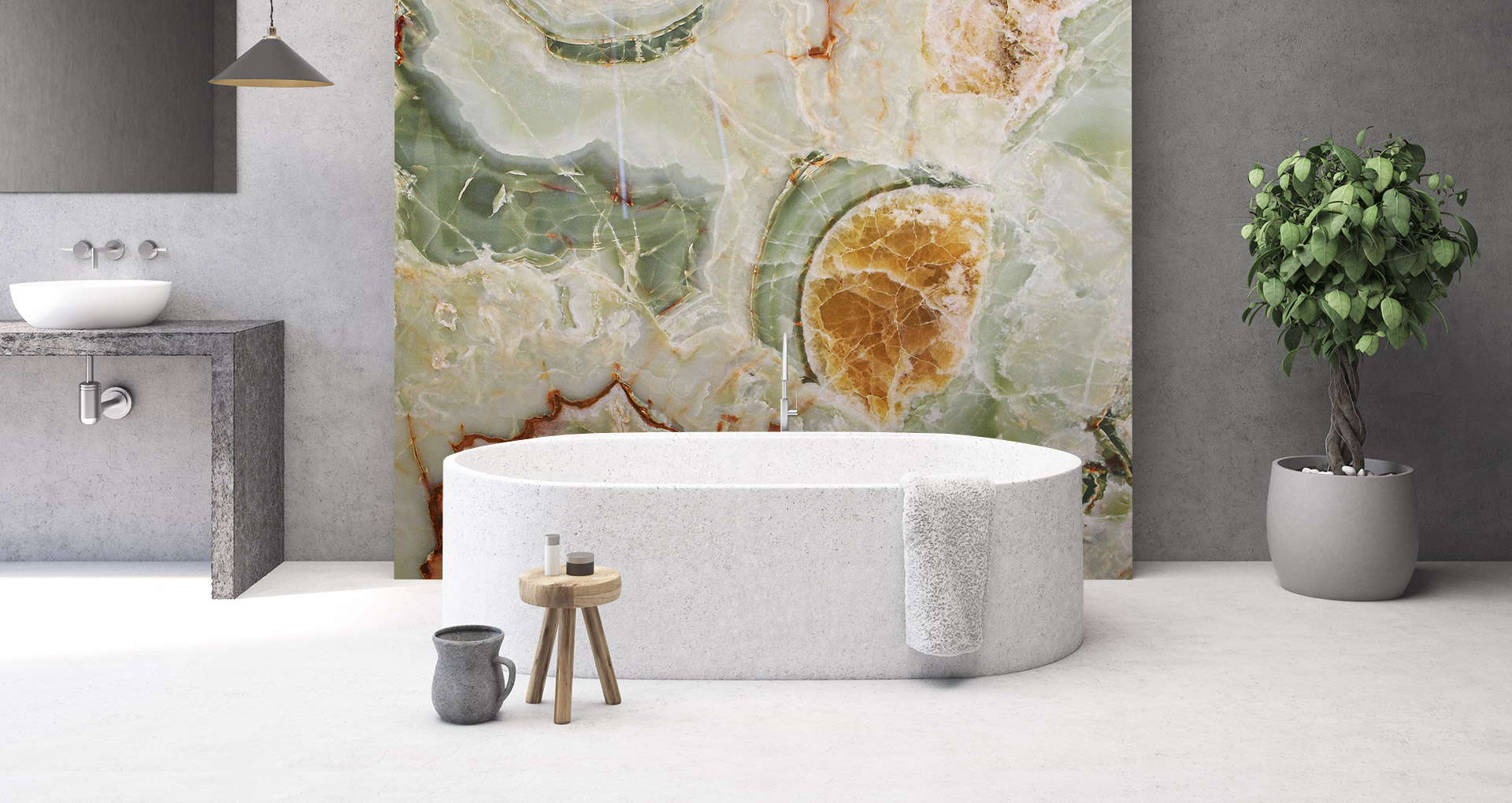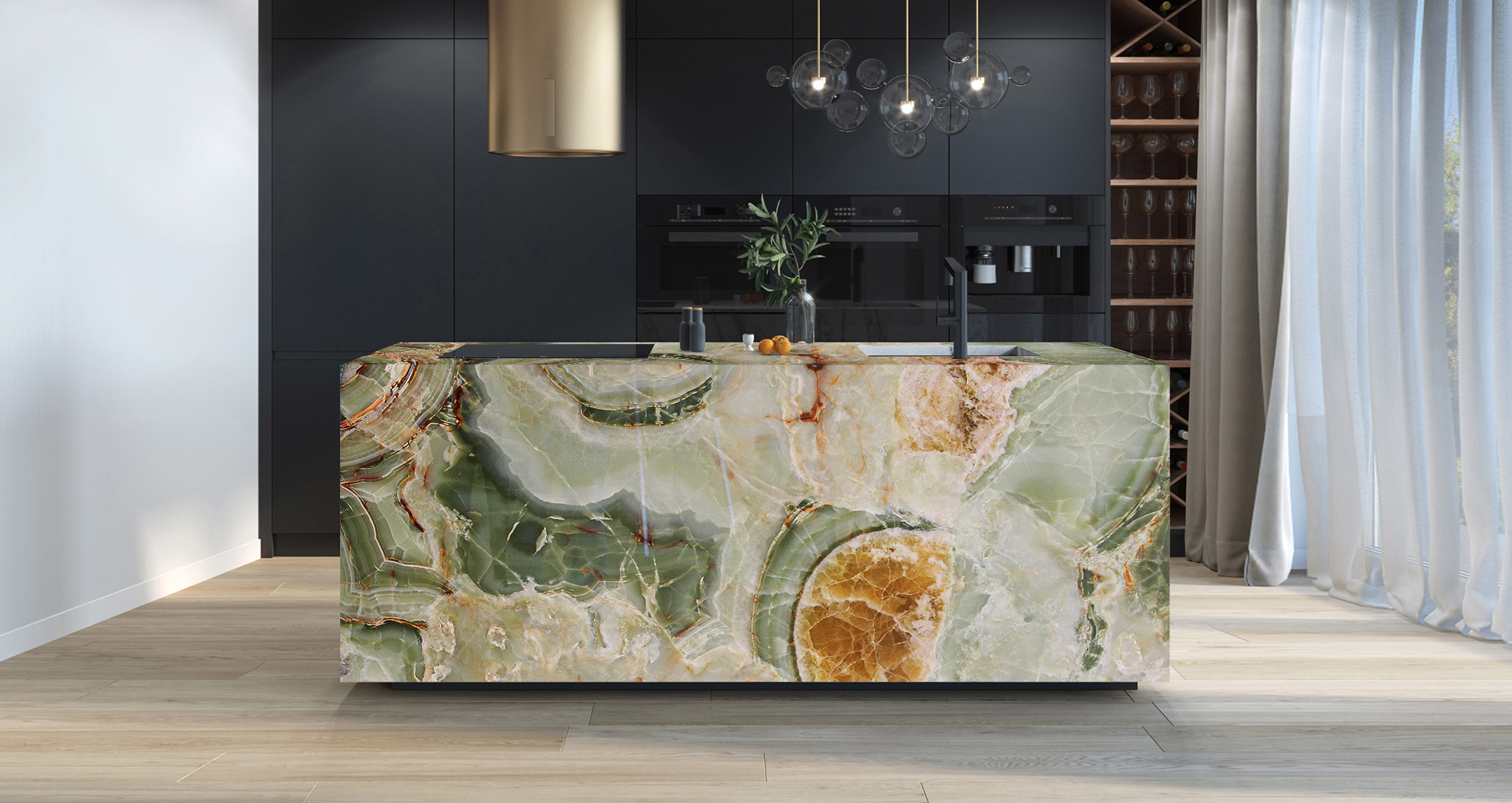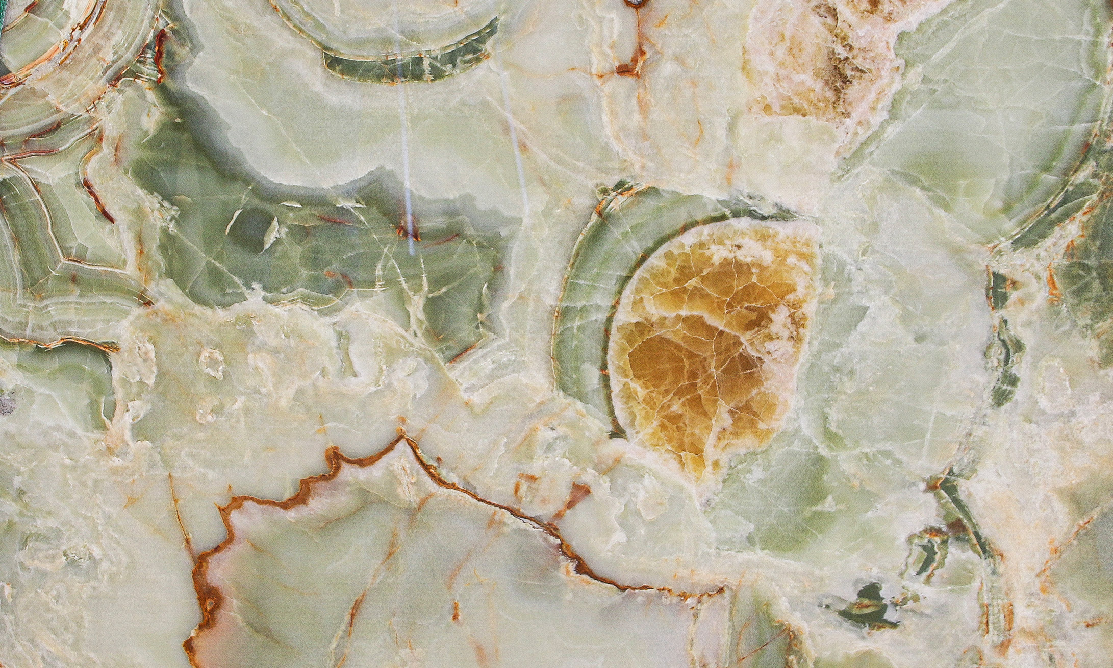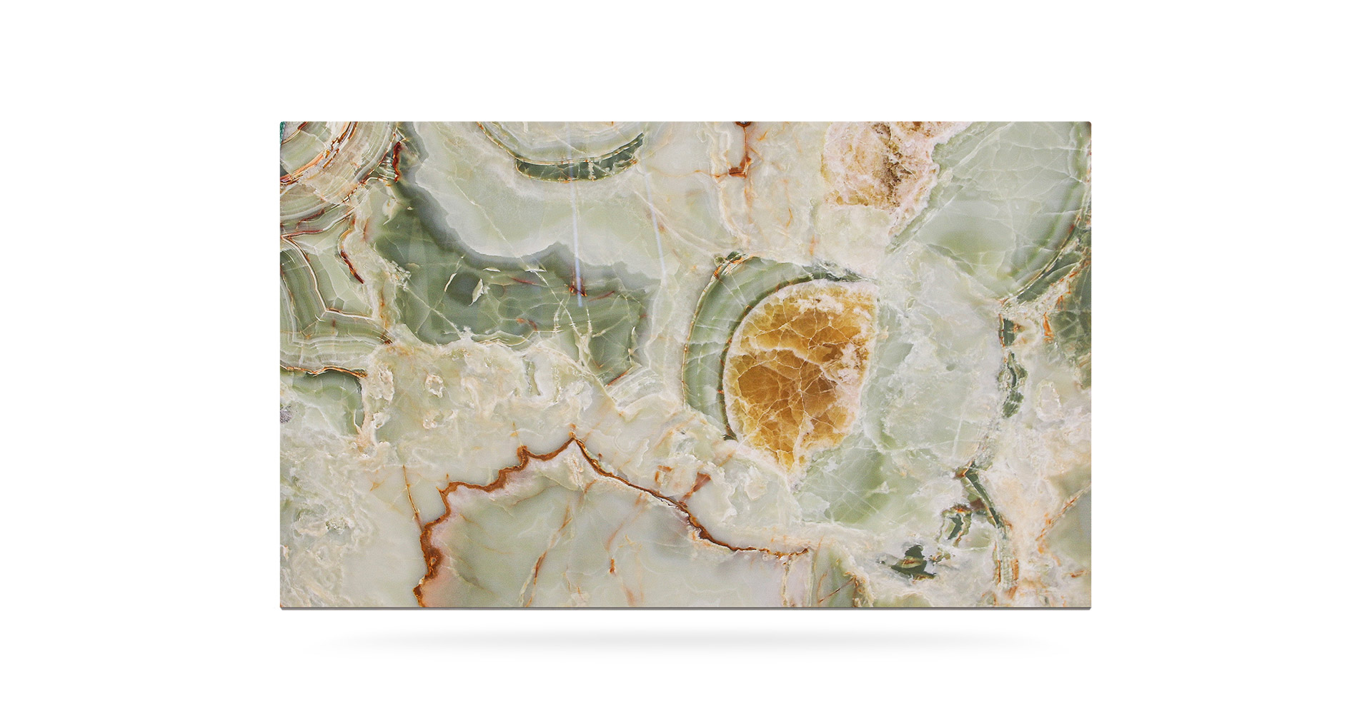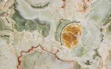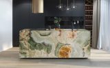 Pregiatissimo onice di colore verde proveniente dal Medio Oriente. Le varie sfumature, sempre sulla graduazione del verde, rendono ogni realizzazione diversa da quella precedente. La sua forma nuvolata viene interrotta talvolta da sottili venature arancioni che rappresentano una caratteristica distintiva di questo materiale. Essendo Onice Verde un materiale naturalmente delicato, ne viene consigliato l'utilizzo in ambienti interni e con finitura lucida.