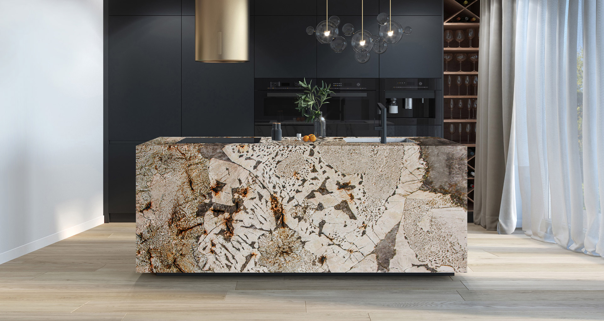 Patagonia è una quarzite brasiliana dal disegno complesso, fatto da colori che si estendono dal beige al marrone, nero e bianco. Questa pietra di origine vulcanica risulta particolarmente adatta all'arredo di interni per via della sua innovativa e ricercata bellezza. Milioni di anni di attività sismica hanno contribuito a rendere questo materiale una pietra di grande durezza e praticità.