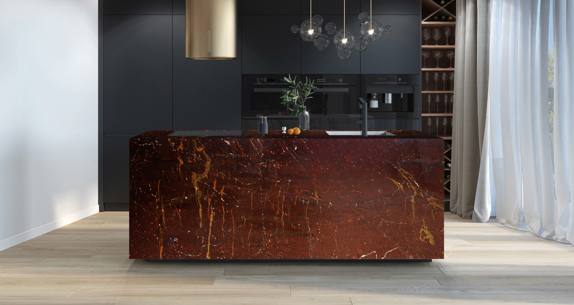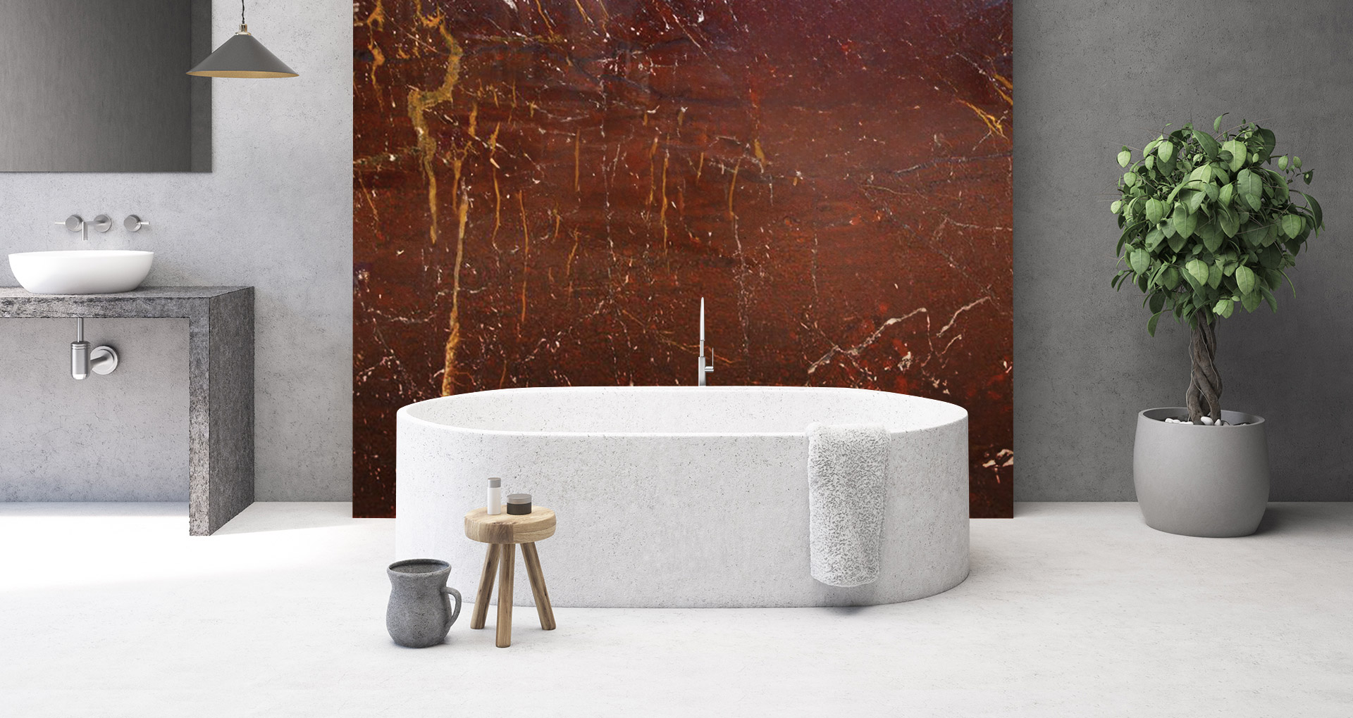 Marmo proveniente dalla Francia di uno spiccato colore rosso intenso, su cui si intrecciano venature irregolari gialle e bianche. Utilizzato principalmente in finitura lucida o levigata, Rouge de Roi è un materiale particolarmente resistente ad urti e sbalzi termici, per questo utilizzato per realizzazioni di design interno ed esterno.