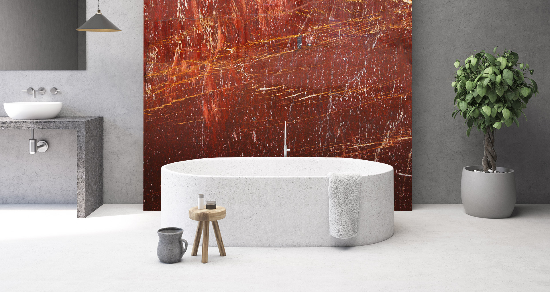 Marmo proveniente dalla Francia di uno spiccato colore rosso intenso, su cui si intrecciano venature irregolari gialle e bianche. Utilizzato principalmente in finitura lucida o levigata, Rouge de Roi è un materiale particolarmente resistente ad urti e sbalzi termici, per questo utilizzato per realizzazioni di design interno ed esterno.