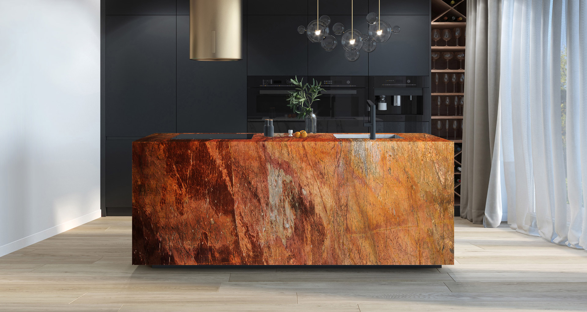 Marmo francese dai colori accesi: rosso ed arancione si alternano con le loro sfumature arricchite da leggere venature che personalizzano ogni lastra donando unicità. Il Rouge Melange è un materiale robusto in grado di resistere al calpestio, agli sbalzi termici e agli acidi: può essere quindi impiegato nell'arredo di ambienti interni come pavimenti e rivestimenti a parete, o ambienti esterni.