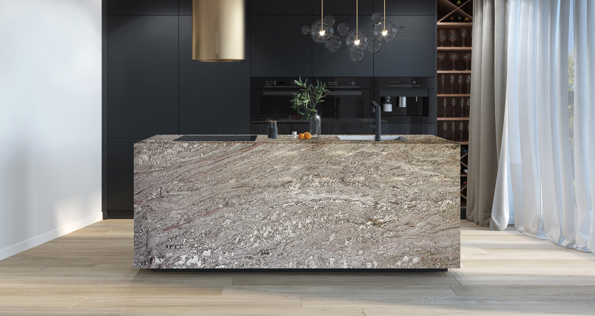 Granito indiano a grana media, con sfondo grigio chiaro e sfumature che variano dal bianco al marrone chiaro. Questo granito, molto resistente, è ideale per decorare con eleganza sia ambienti interni che esterni.