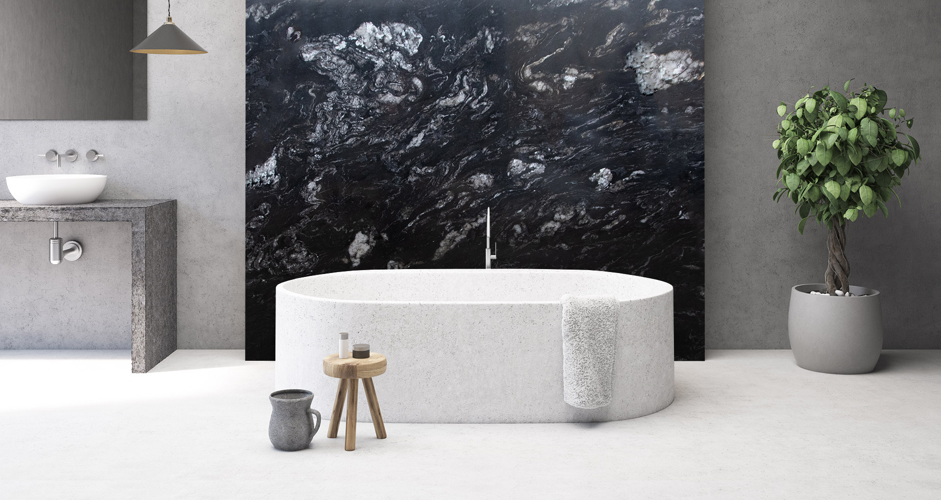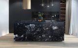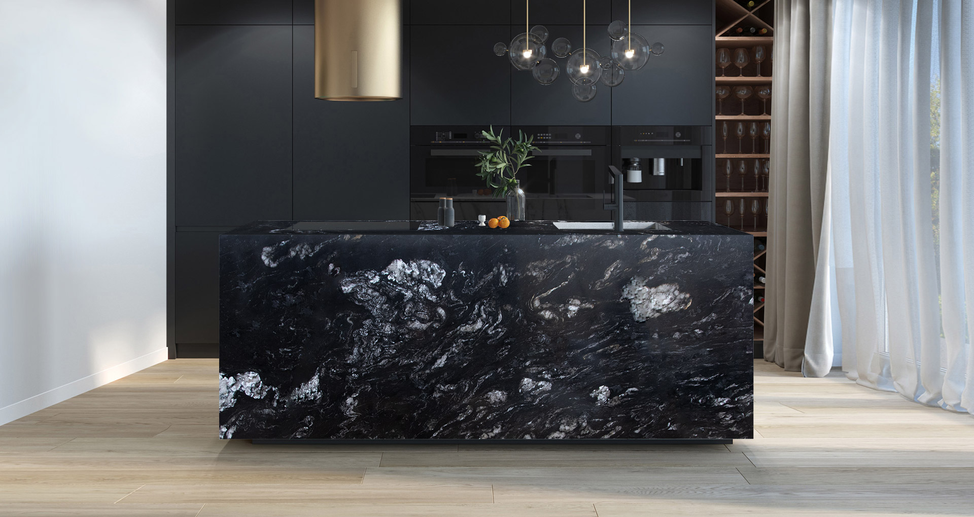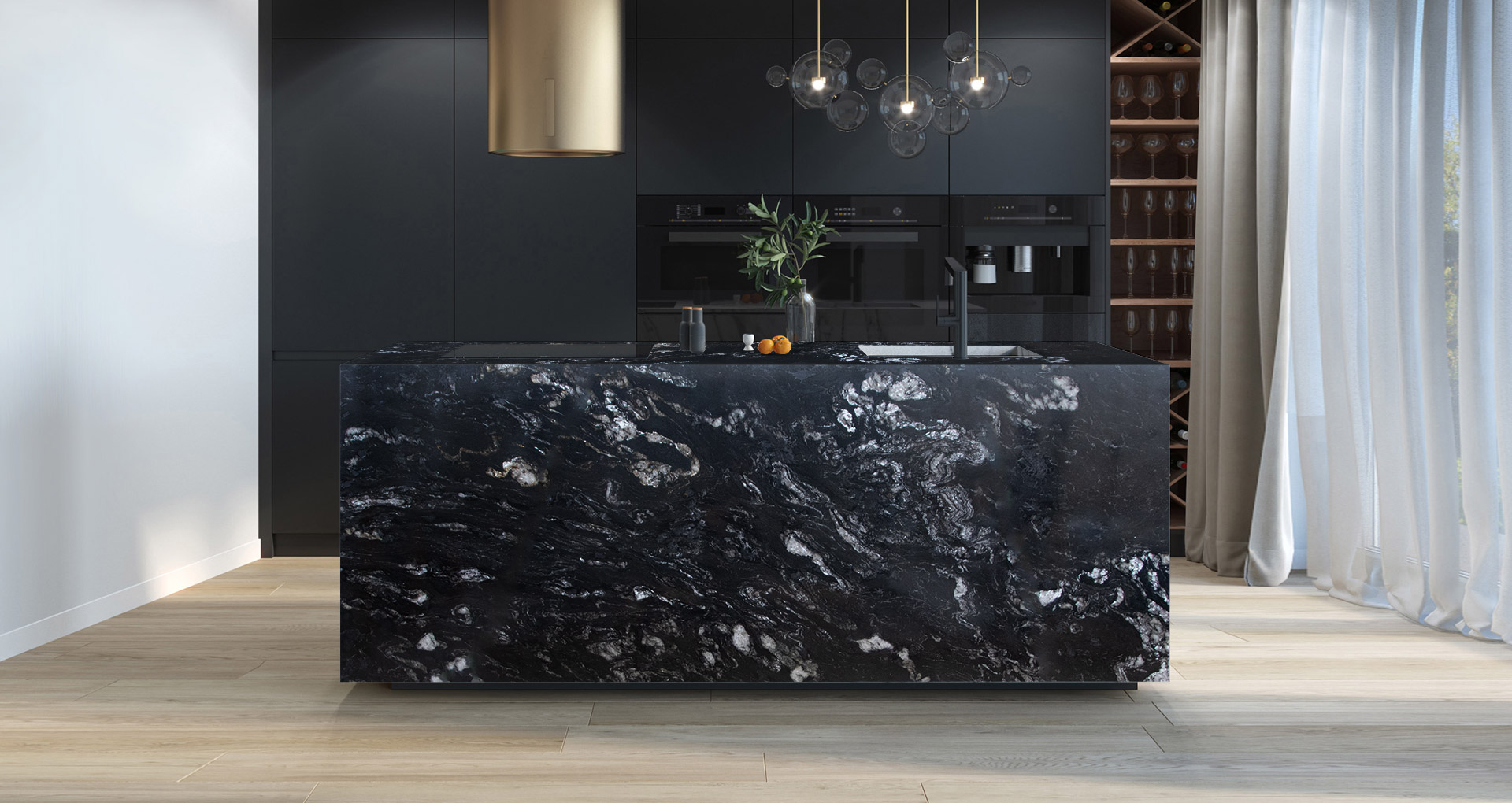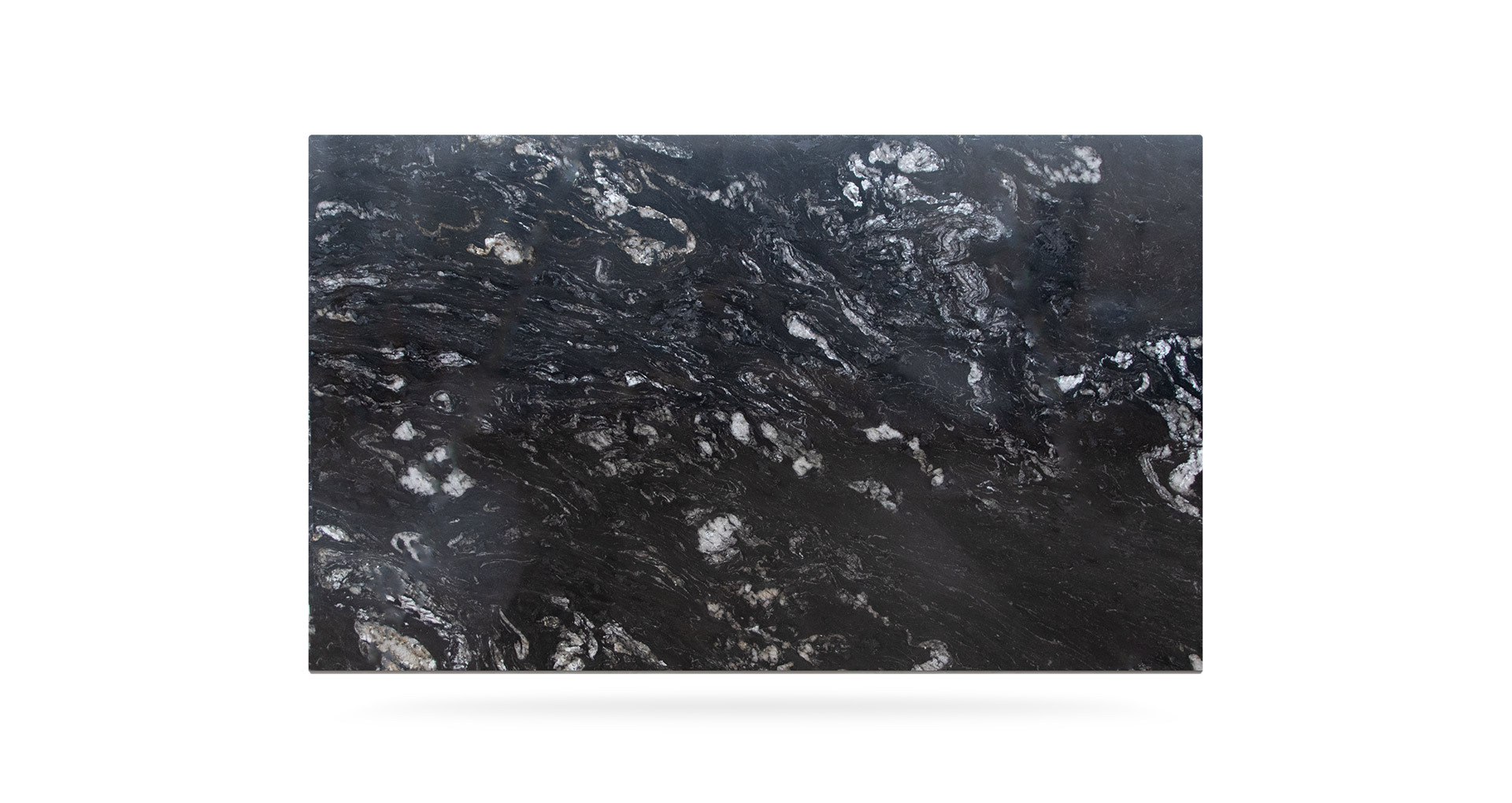 Granito brasiliano dal fondo nero profondo arricchito da cumuli di venature bianche e dorate. Vanta una texture compatta ed uniforme, resistente agli sbalzi termici ed agli acidi. Ideale in edilizia per pavimentazioni, rivestimenti commerciali, facciate, bagni e cucine, viene utilizzato anche in ambienti esterni data la sua compattezza e durevolezza.