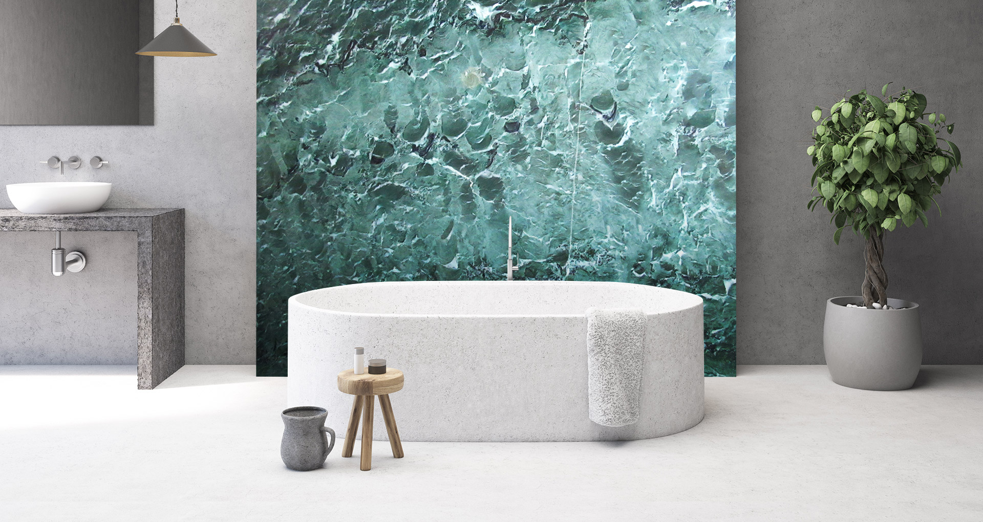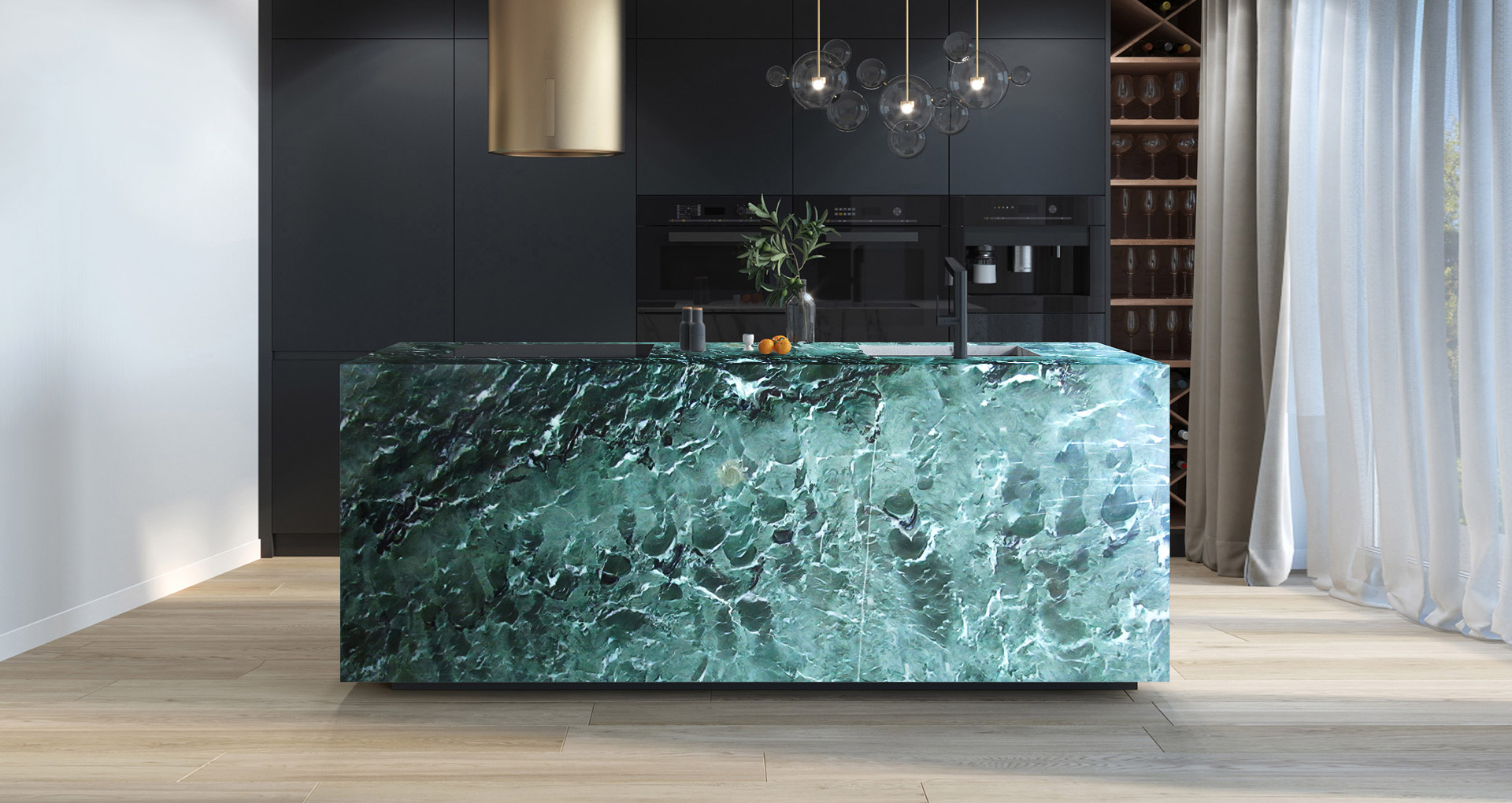 Verde Venezia, marmo australiano dalla struttura nuvolata di colore verde intenso è particolarmente adatto per ampi spazi interni.