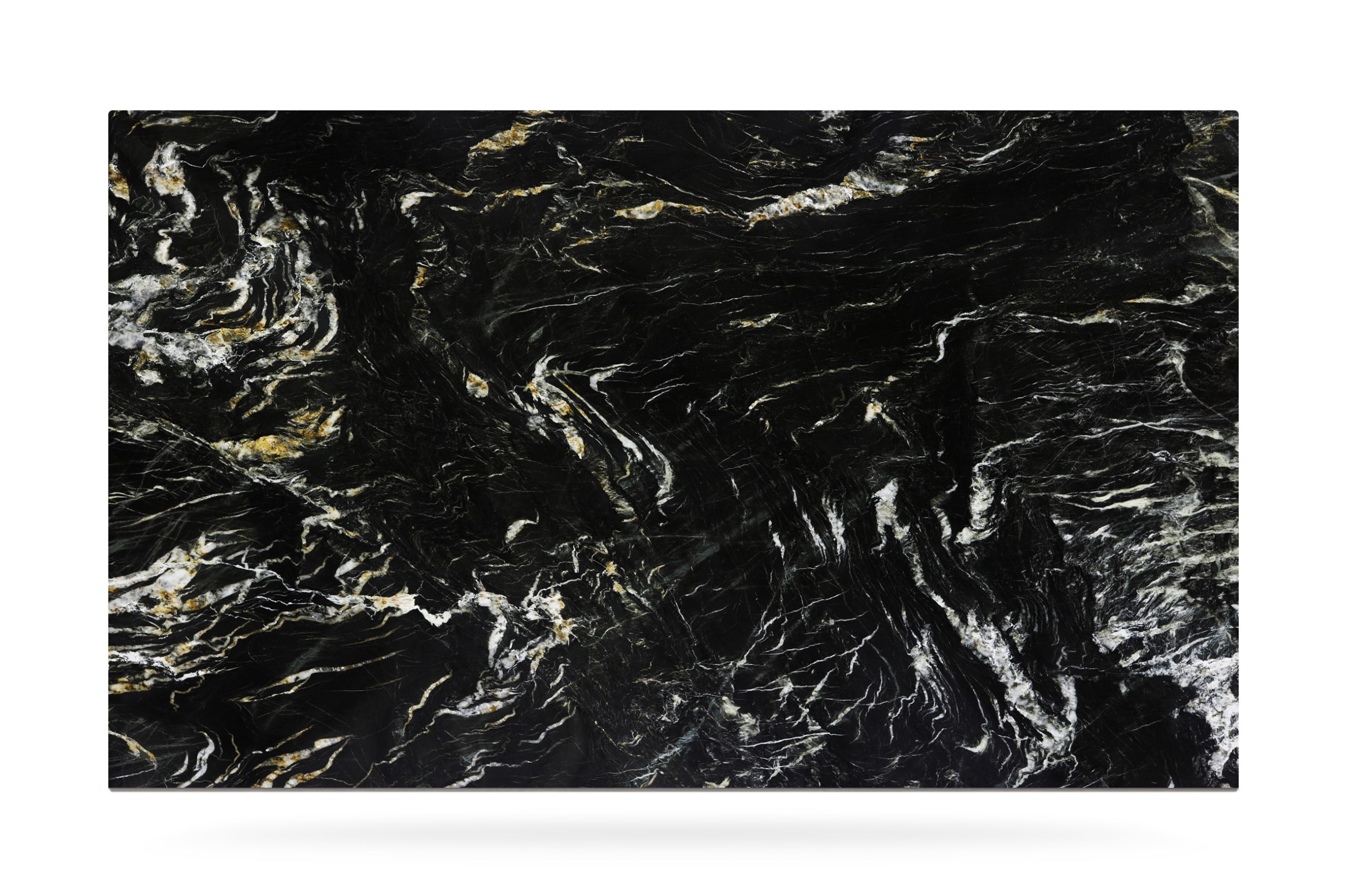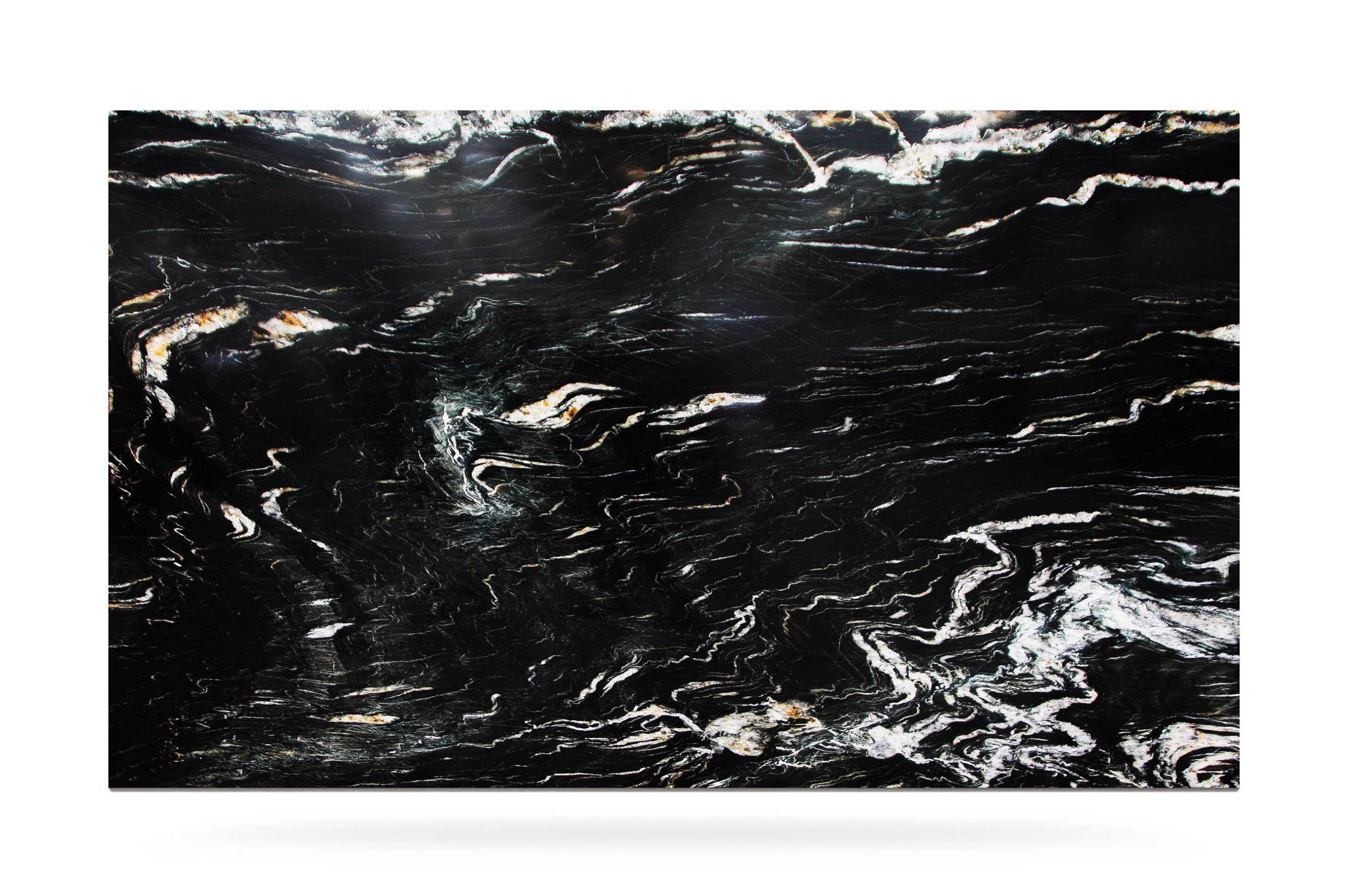 La quarzite Belvedere è caratterizzata da un fondo nero intenso e profondo e le venature dorate, bianche e grigie che si incrociano lungo la superficie creano texture uniche e affascinanti.